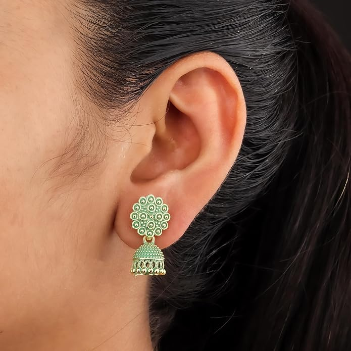 - DESIGN: Traditional jhumki earrings featuring intricate circular floral pattern tops with detailed dome-shaped drops, available in multiple vibrant colours