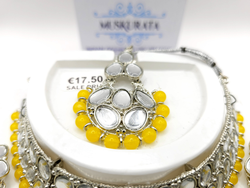 Voeg een vleugje elegantie toe aan je look met onze prachtige kettingset, compleet met bijpassende oorbellen en een sirbindi (hoofdsieraad). Deze set is perfect voor feestelijke gelegenheden, bruiloften of traditionele vieringen.